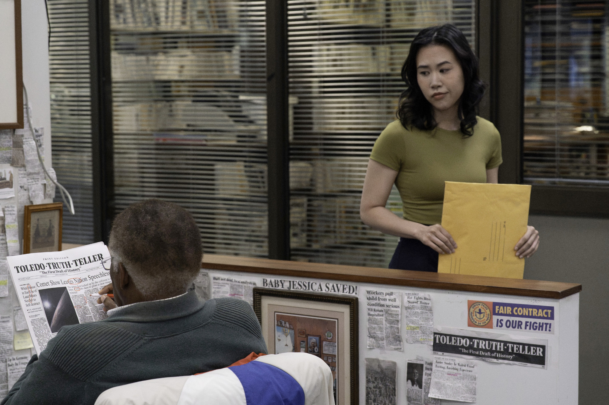 Wracamy do redakcji The Paper. A konkretniej do oferowanego przez nowy serial humoru. Miło mi donieść, że wypracowana przez ekipę ze Scranton formuła dalej działa i mimo pewnych zmian, ani trochę się nie zestarzała. Każdy z dziesięciu epizodów to kolejny problem do rozwiązania przez redakcję. Usilne poszukiwanie lokalnego tematu, po którym Ned… sam stał się lokalnym tematem, walka z newsowym nastoletnim blogerem, poszukiwanie internetowego trolla, czy kryzys związany z papierem toaletowym produkowanym przez firmę matkę gazety.